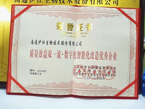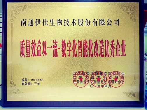 經(jīng)江蘇省市場(chǎng)質(zhì)量監督委員會(huì )、江蘇省數字化智能化改造調研中心、江蘇名牌事業(yè)促進(jìn)會(huì )綜合調查審核評議,南通伊仕生物技術(shù)股份有限公司符合江蘇省質(zhì)量效益雙一流·創(chuàng )新驅動(dòng)轉型升級優(yōu)秀企業(yè)的條件,被評為《江蘇省質(zhì)量效益雙一流·創(chuàng )新驅動(dòng)轉型升級優(yōu)秀企業(yè)》。