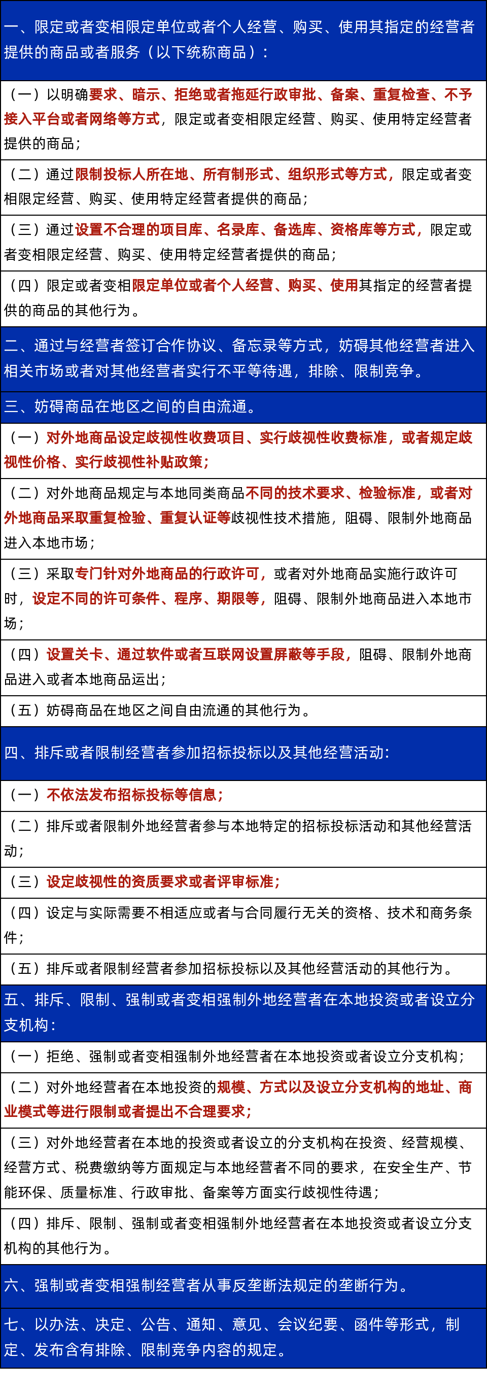 不僅如此,在此之前國家還印發(fā)了《制止濫用行政權力排除、限制競爭行為規定》,對行政機關(guān)濫用行政權力排除、限制競爭的7大類(lèi)違規行為做出了明確規定: