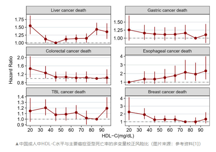 關(guān)于位點(diǎn)特異性癌癥,研究者僅在HDL-C和肝癌死亡率之間發(fā)現了U形關(guān)聯(lián)。與參考水平40 mg/dL~49 mg/dL相比,HDL-C<30 mg/dL(HR 1.55,95% CI:1.28~1.87)和>80 mg/dL(HR高于1.35,95% CI高于1.10)與肝癌死亡風(fēng)險較高相關(guān)。此外,HDL-C<40 mg/dL(HR 高于 1.90,95% CI 高于 1.20)受試者的乳腺癌死亡率顯著(zhù)更高,而HDL-C>70 mg/dL的受試者的食管癌死亡率顯著(zhù)更高(HR高于1.90,95% CI高于1.10)。