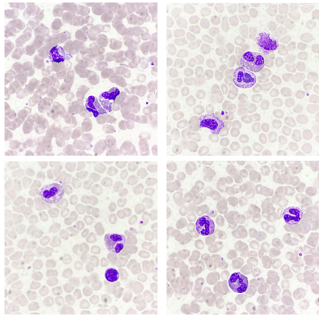 入院檢查雙耳前、耳后、頸前、頸后、腹股溝皆可扣及淋巴結腫大,質(zhì)軟,界清,易推動(dòng),部分融合。當遇到這樣一份血液細胞形態(tài)(骨髓+外周血)送檢單時(shí),筆者首先想到的是—淋巴瘤。在鏡檢時(shí),淋巴細胞易見(jiàn),未見(jiàn)典型的淋巴瘤細胞,取而代之的是較多的嗜酸性粒細胞,見(jiàn)圖1~2: