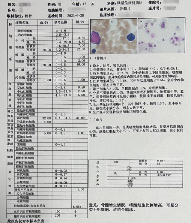 血片意見(jiàn):白細胞不少,嗜酸性粒細胞增高,異型淋巴細胞4.0%,成熟紅細胞大小不一,可見(jiàn)小紅、大紅紅細胞,血小板同骨髓。