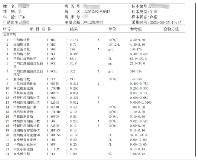 骨髓細胞學(xué)意見(jiàn):骨髓增生活躍,嗜酸性粒細胞增高,可見(jiàn)分類(lèi)不明細胞,請結合臨床,骨髓細胞學(xué)檢查初步排除淋巴瘤骨髓浸潤及血液病可能?;颊叩氖人嵝粤<毎吲c全身淋巴結腫大有必然的聯(lián)系么?當患者出院后,查閱了患者的相關(guān)實(shí)驗檢查,見(jiàn)圖4: