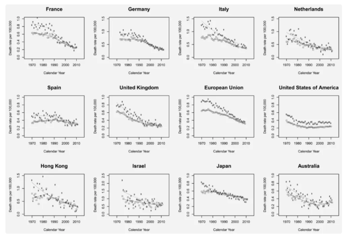 1970 年至 2012 年,在不同國家和地區,女性甲狀腺癌死亡率穩定下降,圖片來(lái)源:參考文獻[4]