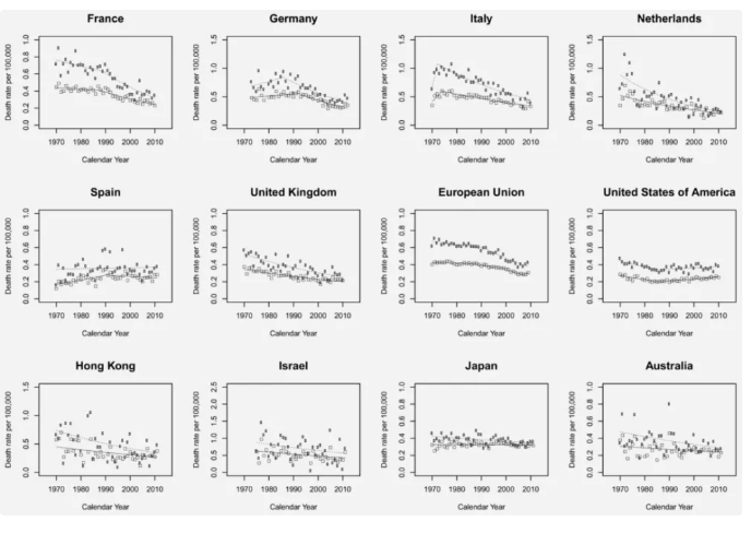 1970 年至 2012 年,在不同國家和地區,男性甲狀腺癌死亡率穩定下降,圖片來(lái)源:參考文獻[4]