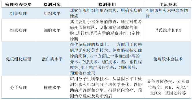 病理學(xué)根據發(fā)展階段的不同主要分為傳統病理技術(shù)(組織病理、細胞病理)、免疫組化病理和分子病理。傳統的組織病理建立在組織、細胞的水平上,可以通過(guò)病理醫師的顯微鏡診斷來(lái)判斷疾病的性質(zhì)(炎癥性病變還是腫瘤型病變、良性腫瘤還是惡性腫瘤等);免疫組化病理建立在蛋白質(zhì)水平上,可以進(jìn)一步判斷腫瘤的組織來(lái)源、原發(fā)部位、病理分型、殘留邊緣癌細胞等,除了診斷作用以外還具有指導預后的作用;分子病理建立在核酸分子水平上,可以確定腫瘤的基因突變類(lèi)型,用于后續靶向藥物的指導以實(shí)現精準醫療。