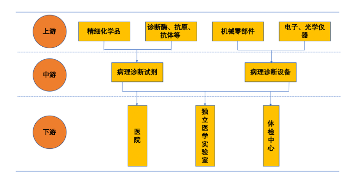 病理行業(yè)產(chǎn)業(yè)鏈包括上游原料市場(chǎng)、中游試劑設備市場(chǎng)下游需求診斷市場(chǎng)。原料包括生物與化學(xué)原材料以及各種機械零配件,分子病理還會(huì )涉及到引物、探針等;中游包括病理診斷試劑和病理診斷儀器;下游需求主要來(lái)自于醫院、第三方獨立醫學(xué)實(shí)驗室、體檢中心、政府等。
