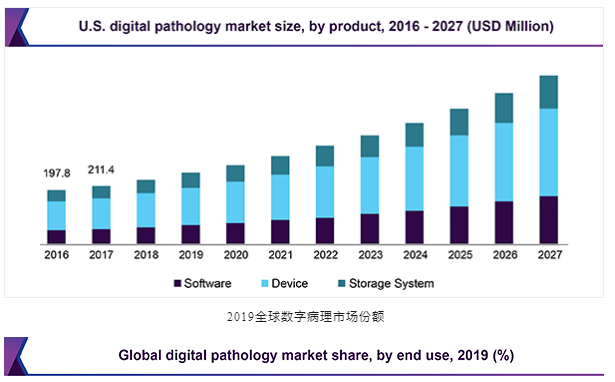 據2020年世界病理學(xué)大會(huì )報告,預計到2024年,病理學(xué)市場(chǎng)規模將從2019年的303億美元達到444億美元,從2019年到2024年的復合年增長(cháng)率為6.1%。據GrandViewResearch預測,2019年全球數字病理學(xué)市場(chǎng)規模為7.676億美元,預計到2027復合年增長(cháng)率為11.8%。根據最終用途,醫院在2019年占據了領(lǐng)先的市場(chǎng)份額。醫院采用數字掃描技術(shù)以加快診斷速度并提高患者依從性。就收入而言,2019年北美市場(chǎng)份額最大。
