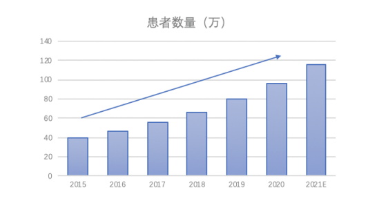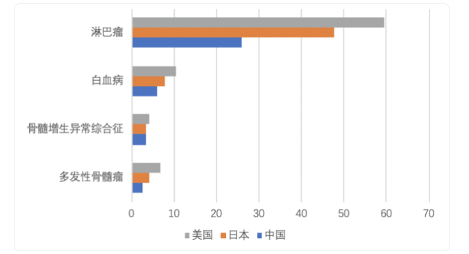 根據上圖所示,多發(fā)性骨髓瘤在中國、日本、美國的發(fā)病率分別為2.5/100000,4.4/100000,6.7/100000;骨髓增生異常綜合癥在中國、日本、美國的發(fā)病率3.4/100000,3.5/100000,4.2/100000;白血病在中國、日本、美國的發(fā)病率分別為6.1/100000,7.8/100000,10.6/100000;淋巴瘤在中國、日本、美國的發(fā)病率分別為25.9/100000,47.6/100000,59.4/100000。由此可見(jiàn)2008年-2015年的四種血液腫瘤發(fā)病率呈現逐年上升的趨勢,其中淋巴瘤發(fā)病率最高,平均高達44.3。