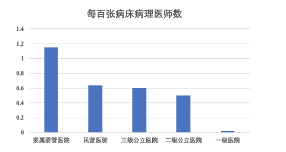如上圖所示,其中委屬委管醫院每百張病床病理醫師數僅為1.15,三級公立醫院、二級公立醫院和民營(yíng)醫院分別為0.60、0.50及0.64。根據最新發(fā)布的《2019年全國病理質(zhì)量報告》顯示,在不同級別的醫院中,全國平均每百張病床病理醫師數量為0.55,病理醫師數量奇缺的狀況沒(méi)有改善,各省、自治區、直轄市均未達到2009年《病理科建設與管理指南(試行)》(以下簡(jiǎn)稱(chēng)《指南》)的最低要求(每百張床1-2名病理醫師)。