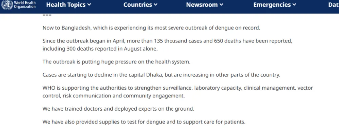 世衛組織警告:孟加拉國遭受史上最嚴重登革熱疫情 氣候危機使問(wèn)題惡化
